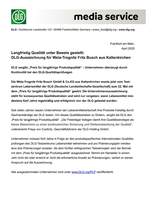 DLG vergibt Auszeichnung „Preis für langjährige Produktqualität“ – Unser Unternehmen überzeugt seit Jahren in den DLG-Qualitätsprüfungen