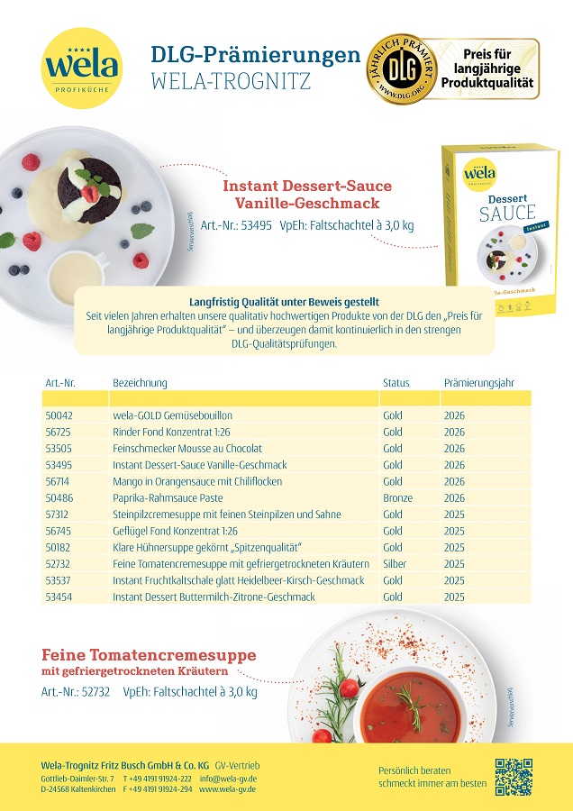 Wela-Trognitz erreicht erneut hervorragende Ergebnisse bei anerkannten Tests der DLG Prüfungen für Convenience-Food in Bad Salzuflen.