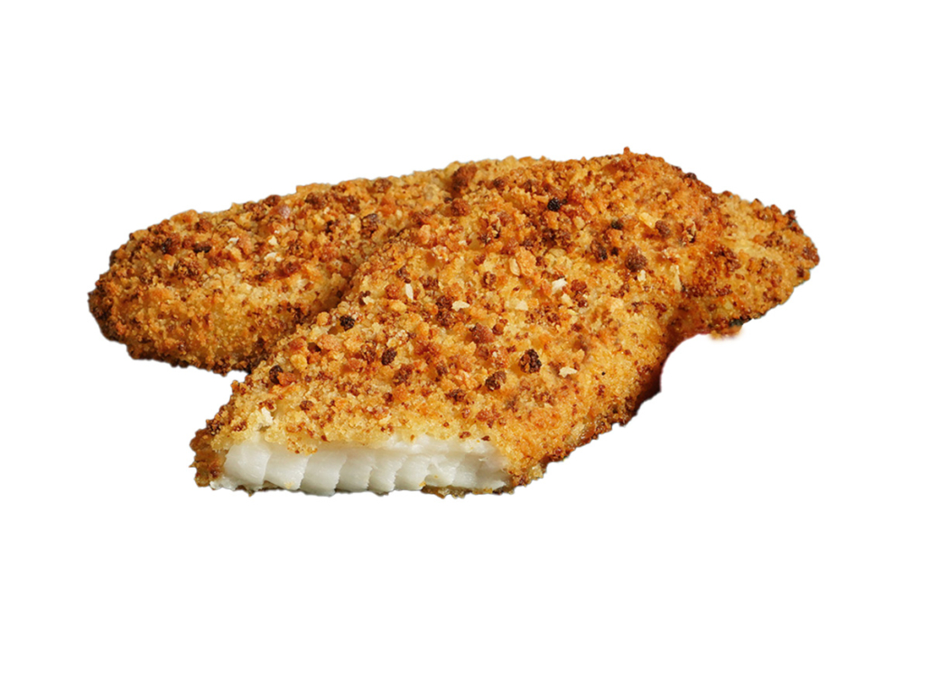 Alaska-Seelachs, praktisch grätenfrei, aus Blöcken geschnitten, aus Fischstücken zusammengefügt, mit Laugengebäck-Paniermehl paniert, vorgebraten, tiefgefroren.