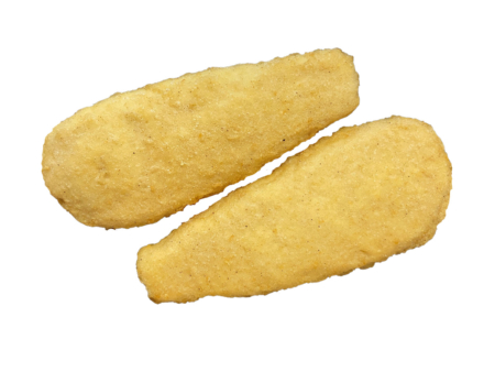 Zartes Alaska Seelachsfilet im Backteig ummantelt, aus Fischstücken zusammengefügt, aus Blöcken geschnitten, in Filetform gefertigt, vorgebraten, praktisch grätenfrei, tiefgefroren.