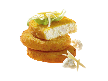 Ovale Medaillons mit goldbrauner Kruste, hergestellt aus Blumenkohl und Käse, mild gewürzt, ausgeformt, paniert, vorgebacken und freifließend tiefgefroren.