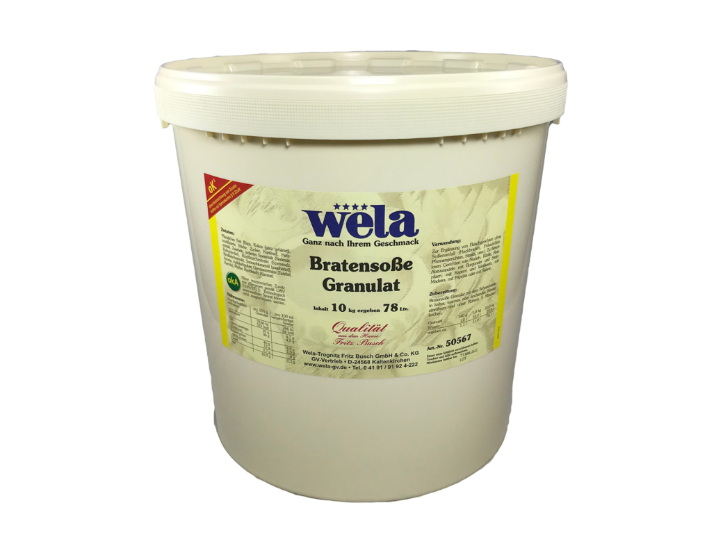 Die Bratensoße ist eine gebundene, kräftige braune Soße, die zu vielen gebratenen Fleischspeisen gereicht werden kann. Sie eignet sich bestens als eigenständige Soße und zum stärken und ergänzen von bestehenden Soßen. Das Granulat hat eine hervorragende Löslichkeit und Streufähigkeit, ein mehrfaches Nachdosieren für die optimale Bindung ist möglich.