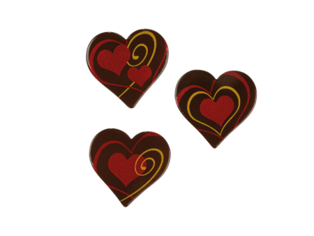 Verschiedene Valentinstags-Dekore aus weißer Schokolade mit buntem Aufdruck.