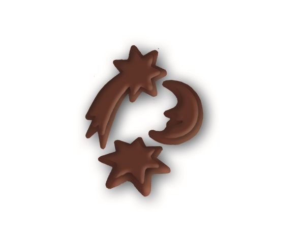 Dunkelbraune Schokoladendekore in verschiedenen weihnachtlichen Formen. Kakao: 57 % mindestens.