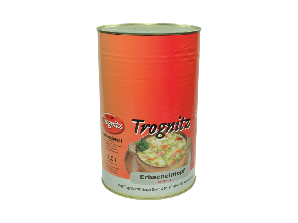 Trinkwasser, 22 % Erbsen, 12 % Gemüsemischung (Kartoffelwürfel, Karottenwürfel, Lauch, SELLERIEWÜRFEL ), 3,5 % geräucherter Bauchspeck (Schweinefleisch, Speisesalz, Gewürze, Gewürzextrakte, Buchenholzrauch), Erbsenmehl, aufgeschlossenes Pflanzeneiweiß, Hefeextrakt, Zucker, Rapsöl, Dextrose, Speisesalz, Würze, Aroma, Verdickungsmittel (Guarkernmehl, Xanthan), Pfefferextrakt.Produkt enthält: Sellerie.