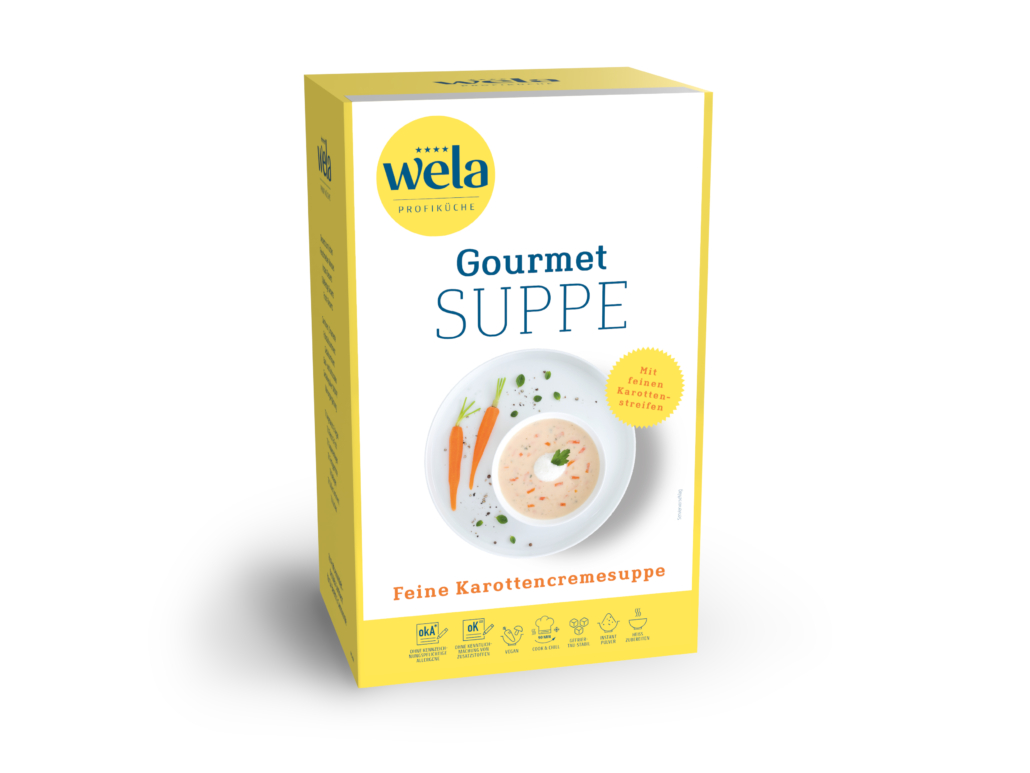 Diese helle, leicht getönte, cremig gebundene Suppe mit reichlicher Einlage von Karotten- und Kartoffelstreifen. Eine fein abgestimmte Gewürzmischung runden die Suppe ab. Diese Suppe zeichnet sich durch ihren typischen Geschmack aus.