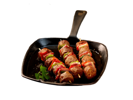 Pikante Kombination aus gebratenen Fleischklößchen vom Schwein mit geräuchertem Speck und knackig-frischer Paprika, auf Holzspieße gesteckt, vorgegart, tiefgefroren.