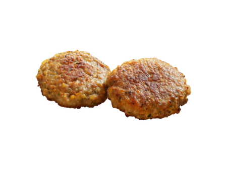 Geflügelfrikadelle von mittelfeiner Körnung und sehr milder Würzung, vereinzelt Kräuter und Gewürze erkennbar, ohne Fett. Nach dem Auftauen nicht wieder einfrieren.