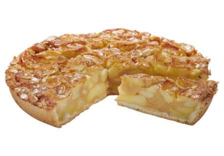 Ein Mürbteig reichlich gefüllt mit Äpfeln, leicht bedeckt mit gerösteten Mandelblättchen, Zimt und einer feinen Schicht Gelee. Durchmesser 28 cm.