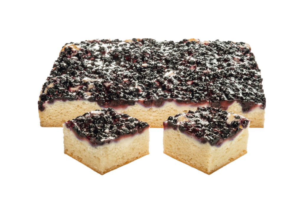 Auf einer erfrischenden Rührmasse mit Limettengeschmack liegen eine lockere Creme mit Vanillegeschmack und Wildheidelbeeren. Mit Gelee abgeglänzt.