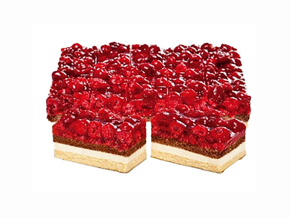 Ein heller und ein Schoko-Tortenboden, gefüllt mit einer Sahne mit Vanillegschmack. Die Schnitte ist üppig mit Himbeeren bedeckt und mit Gelee abgeglänzt.