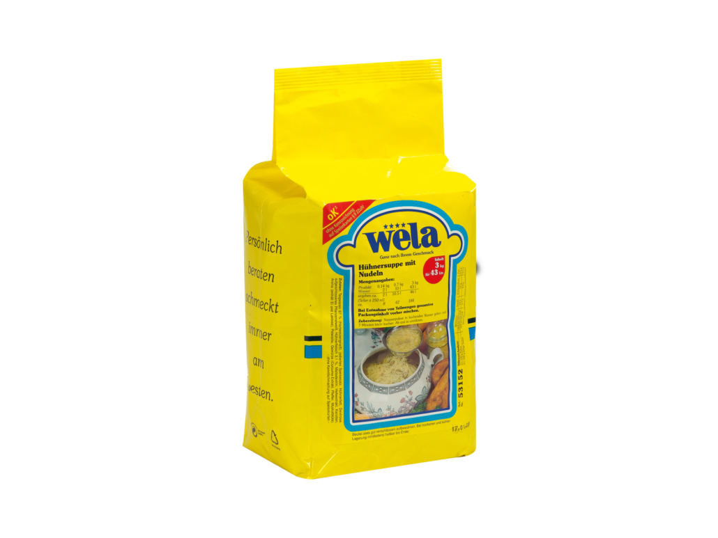 Teigwaren 65 % (HARTWEIZENGRIESS), Maltodextrin, gekörnte Brühe (aufgeschlossenes Pflanzeneiweiß, Speisesalz, Hühnerfleisch und -Fett 10 %, Sonnenblumenöl (ungehärtet)), Speisesalz, Hühnerfett, Dextrose, getrocknetes Hühnerfleisch 4 % , natürliches Aroma, Karotten, Petersilie, Antioxidationsmittel Rosmarin-Extrakt. * ohne technologische Wirkung im zubereiteten Produkt, deshalb ist die Kennzeichnung von Zusatzstoffen auf Speisekarten (gem. deutscher LMZDV) nicht erforderlich.. Produkt enthält: Weizen. Kann Spuren enthalten: Ei, Soja, Milch, Sellerie, Senf