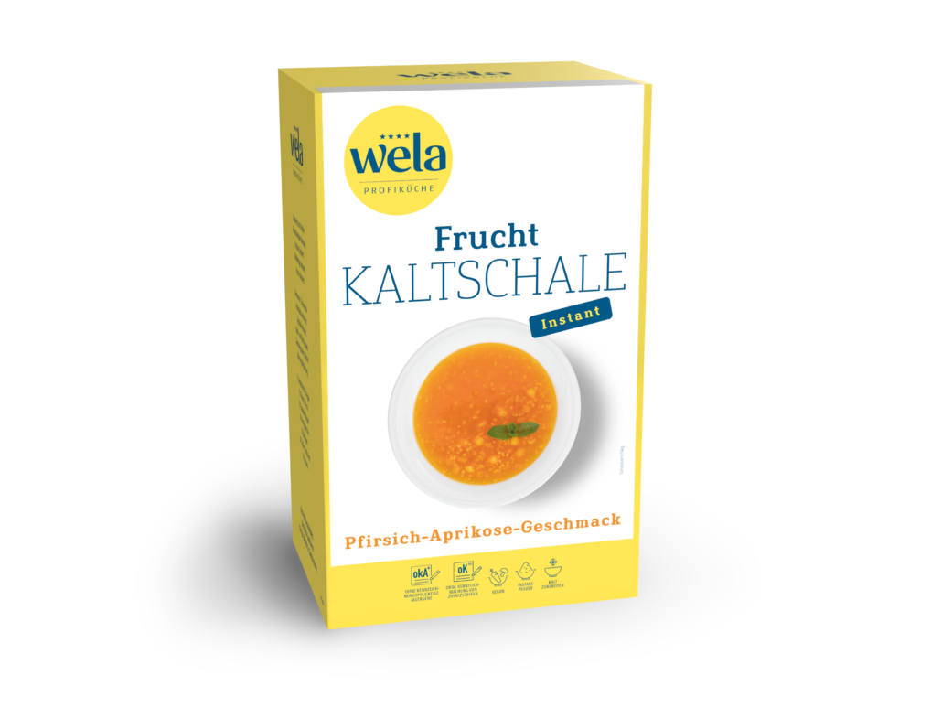 Eine Instant Fruchtkaltschale Pfirsich-Aprikose-Geschmack, die auch zur Zubereitung von Fruchtquark, Fruchtjoghurt, Milch-Shakes und Mixgetränken geeignet ist.