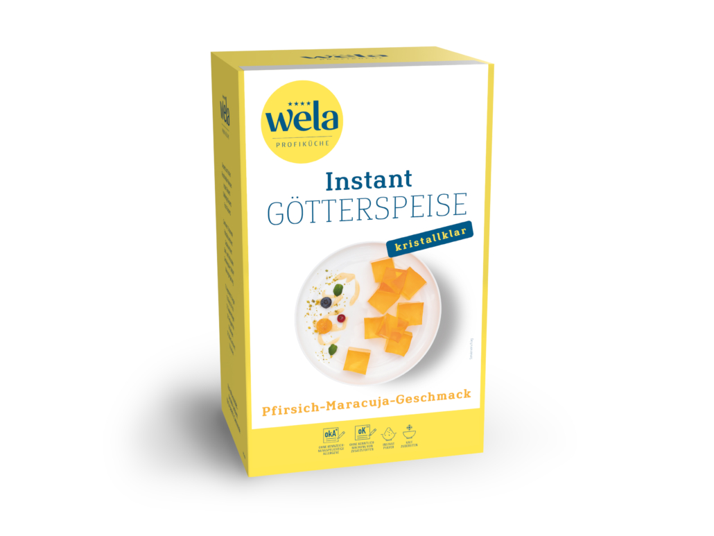 Eine fruchtige Instant-Götterspeise mit Pfirsich-Maracuja-Geschmack fertig gezuckert, die nur mit warmem Wasser zubereitet wird.