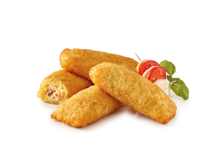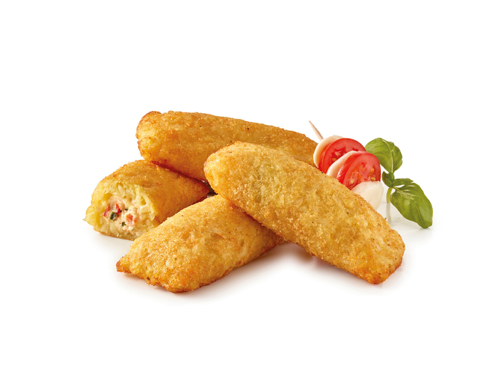 Zylindrisch ausgeformte Kartoffeltaschen, vorgebacken und tiefgefroen.