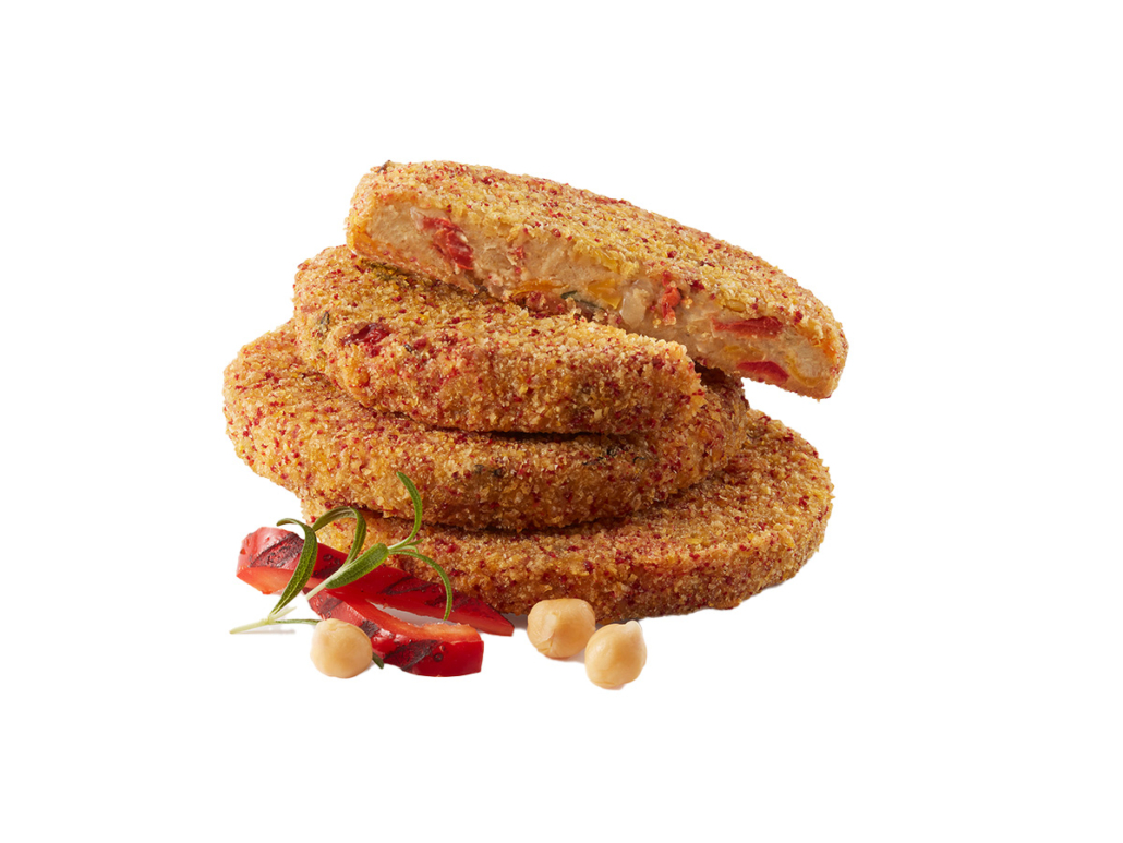 Hergestellt aus gegrilltem Gemüse und Kichererbsen, fein gewürzt ausgeformt, paniert, vorgebacken und freifließend tiefgefroren.