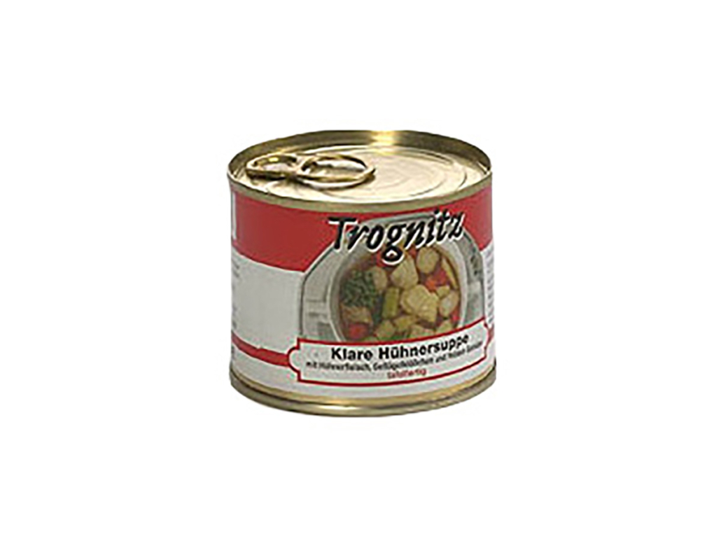 Eine klare, leicht gelbliche Suppe mit ausgeprägtem Huhngeschmack. Als Einlage werden ausschließlich mageres, gewürfeltes Hühnerfleisch, Geflügelklößchen und feines Gemüse eingesetzt.