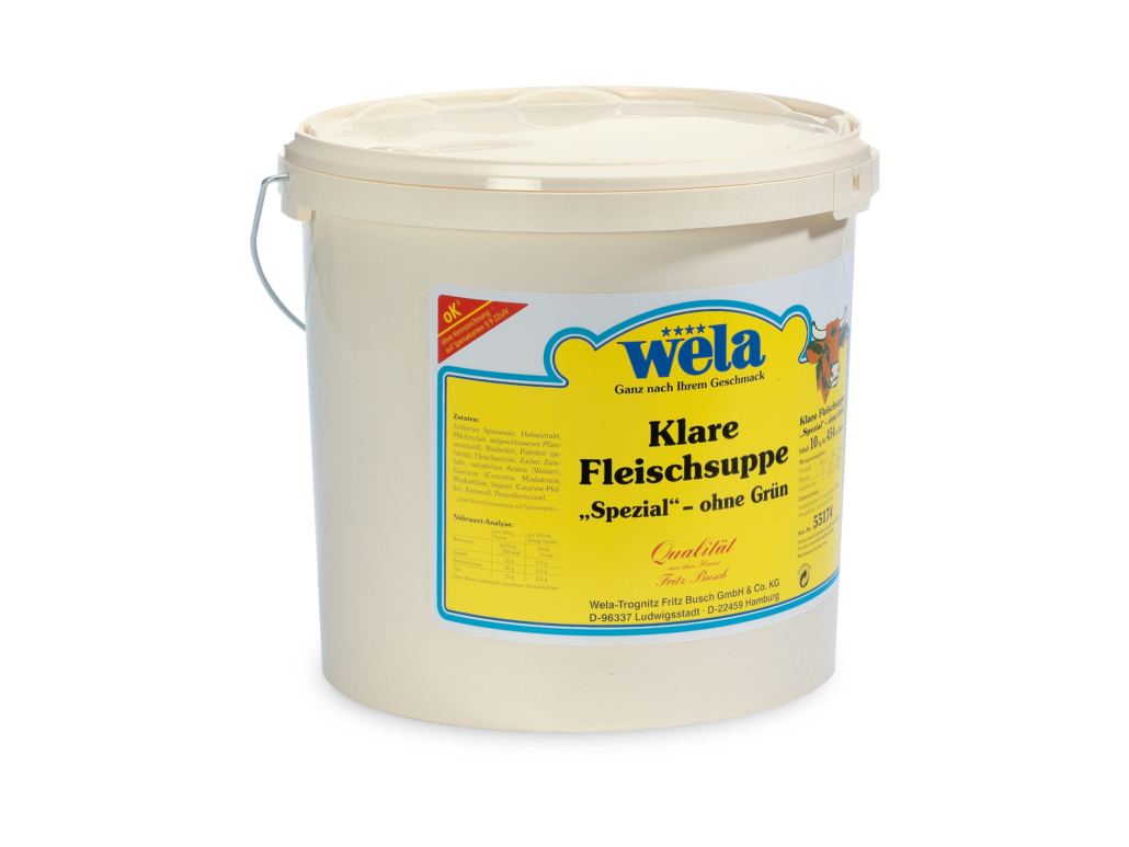 Die klare Fleischsuppe Spezial ist eine Fleischsuppe ohne Einlage von stückigen Bestandteilen, die auf der Basis von aufgeschlossenem Pflanzeneiweiß, Rinderfett und Fleischextrakt sowie einer ausgewogenen Mischung aus Gewürzen und Gemüsepulvern hergestellt wird.
