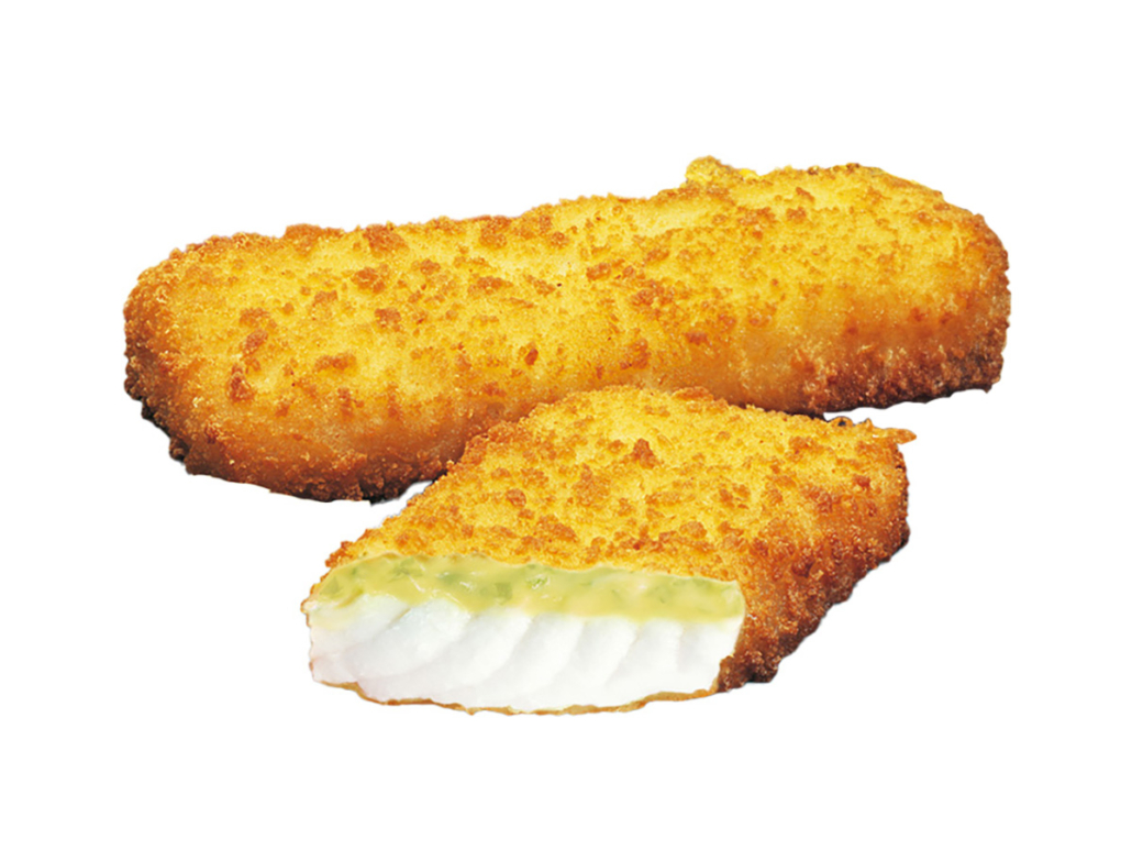 Alaska-Seelachsfilet, praktisch grätenfrei, aus Blöcken geschnitten, mit leckerer Senf-Honig-Füllung (20%), knusprig paniert, vorgebraten, tiefgefroren, aus MSC-zertifizierter Fischerei.