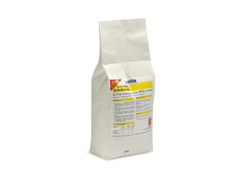 Ein Kochpudding mit Schokoladen-Geschmack, der mit Milch und Zucker zubereitet wird.