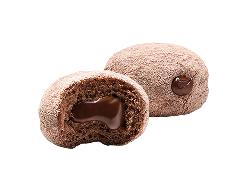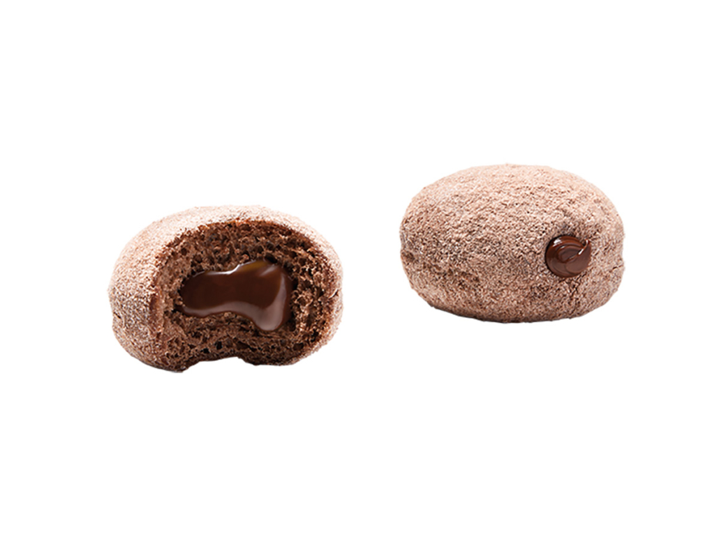 Mini-Siedegebäck mit Kakao und Schokoladenfüllung, mit Traubenzucker abgestaubt, fertig gebacken, tiefgefroren.