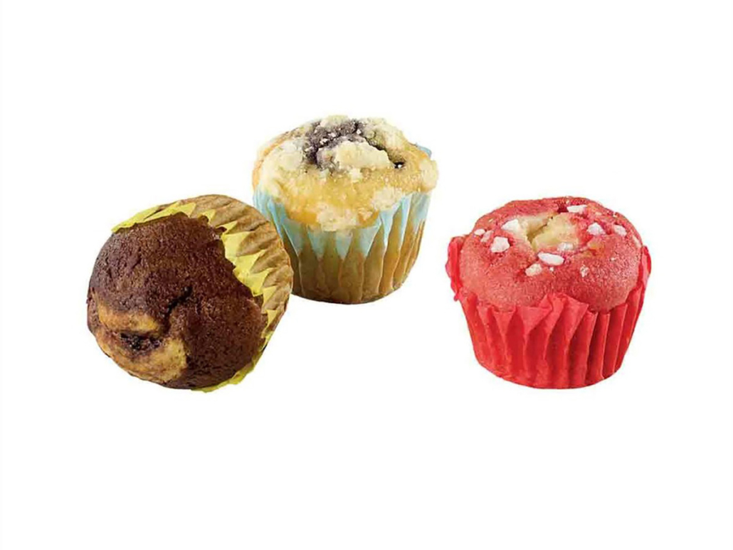 Rührkuchenteig in Muffinform in drrei verschiedenen Geschmacksrichtungen: Red Velvet, Blueberry, Marmor Muffin, fertig gebacken