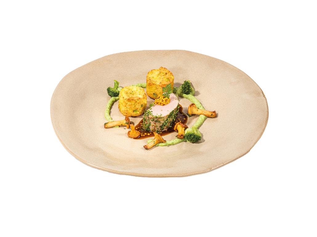 Gratin aus Kartoffelraspeln mit Broccoli, Sahne, Käse und Gewürzen, innen cremig, außen mit goldgelber knuspriger Kruste, vorgebacken, tiefgekühlt.
