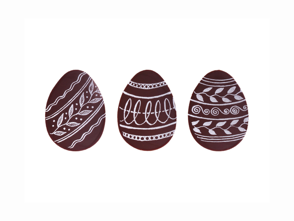 Osterdekor aus Zartbitter-Kuvertüre mit Farbstoff bedruckt. Kakao: mindestens 57 %.