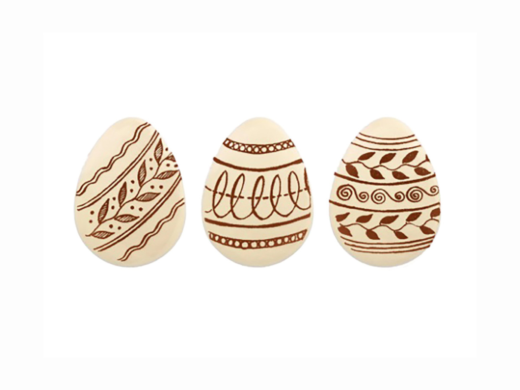 Osterdekore aus weißer Schokolade mit rot/weißem Aufdruck.
