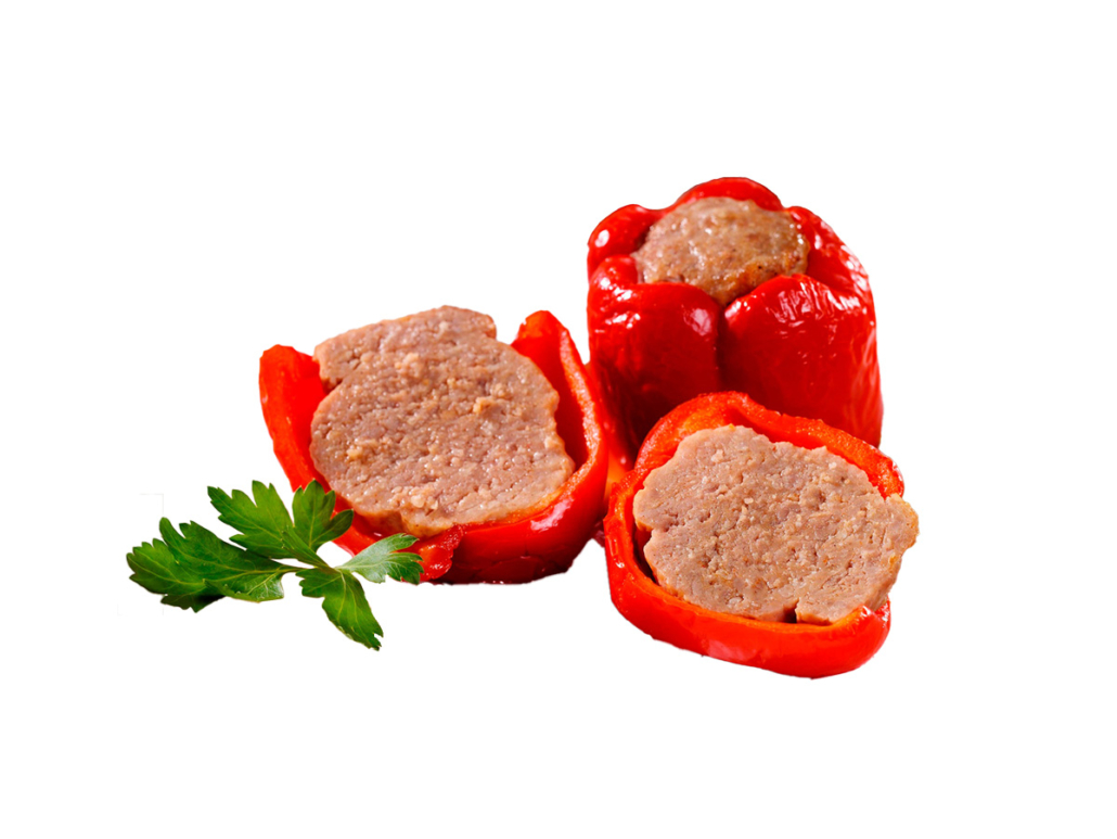 Rote, knackige Paprikaschoten, gefüllt mit frischem z.T. fein zerkleinertem Schweine- und Rinderhackfleisch, verfeinert mit Zwiebeln und Gewürzen, roh tiefgefroren.