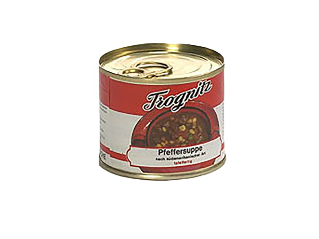 Eine leicht gebundene, rötlich-braune Suppe mit typisch frischen Geschmack nach grünen Pfeffer und einer reichhaltigen Einlage aus Rindfleisch, zartem Mais und frischen roten Paprika.
