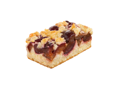 Joghurt-Hefeteig mit Quarkfüllung (9,5 %) mit Frangipangeschmack, belegt mit Pflaumen (46,5 %), dekoriert mit Butterstreuseln, geliert, vorgeschnitten, fertig gebacken, tiefgefroren.
