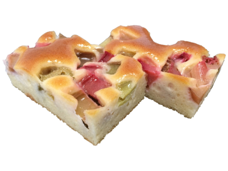 Saftige Sandmasse mit versunkenen Rhabarberstücken und mit Guss überzogen, fertig gebacken, tiefgefroren.