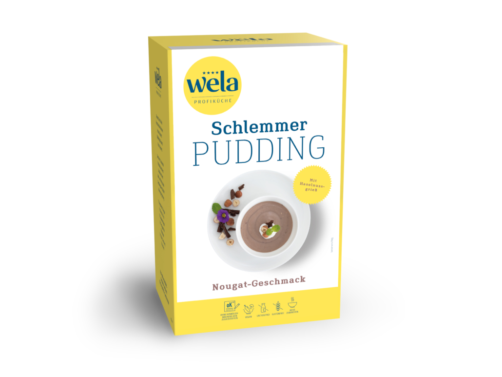 Ein Schlemmerpudding mit Nougat-Geschmack und gemahlenen Haselnüssen, der mit Zucker und Milch zubereitet wird.