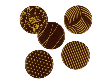 Dunkle Schokolade mit goldenem Aufdruck, sortiert. Kakao: 62 % mindestens.