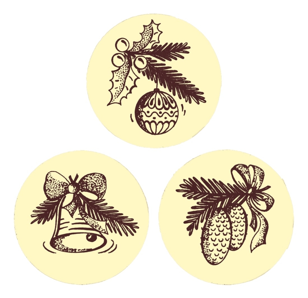 Weiße Schokoladenornamente mit buntem Aufruck. Kakao: 30 % mindestens.