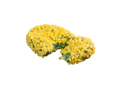Panierte Spinatplätzchen mit nussigen Dinkelkörnern und herzhaftem Gouda, vegetarisch, paniert, vorfrittiert, tiefgefroren.