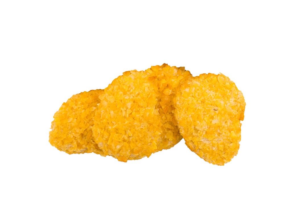 VeganeNuggetsaufBasisvonWeizen-undSojaeiweiß,paniertmitCornflakes,vorgegartundtiefgefroren.EnthältzugefügtesEisen,Zinkund Vitamin B12.
