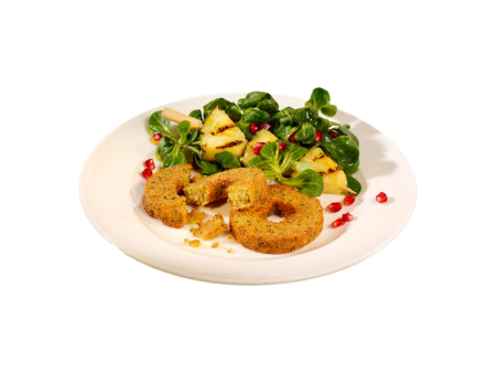 Knuspriger Bagel, hergestellt aus Kichererbsen und Weizenbulgur, verfeinert mit Kräutern und orientalischen Gewürzen, geeignet zur veganen Ernährung, vorfrittiert und tiefgefroren.