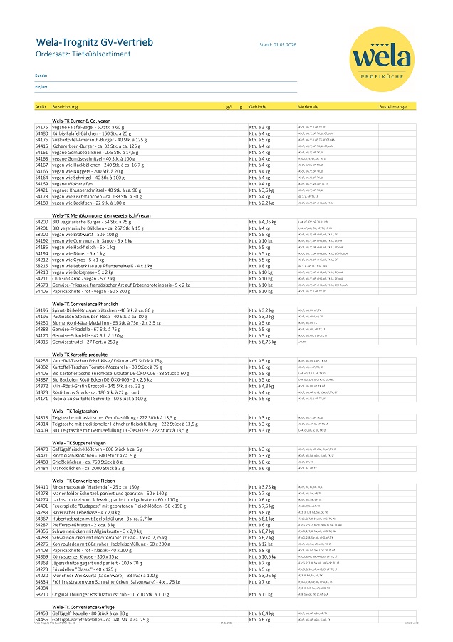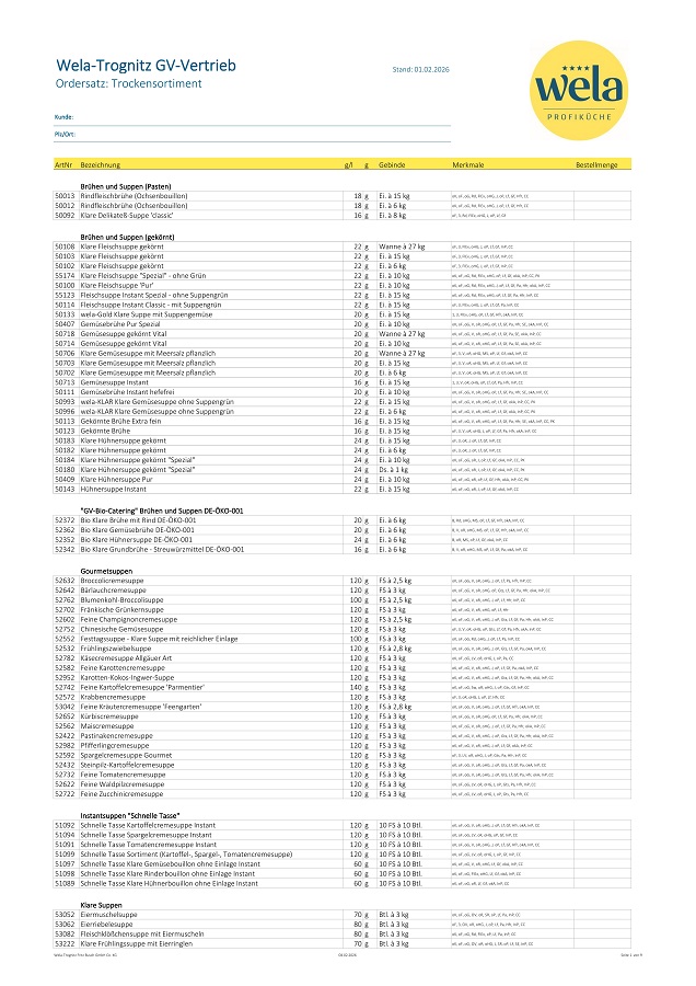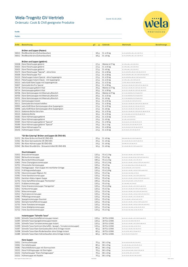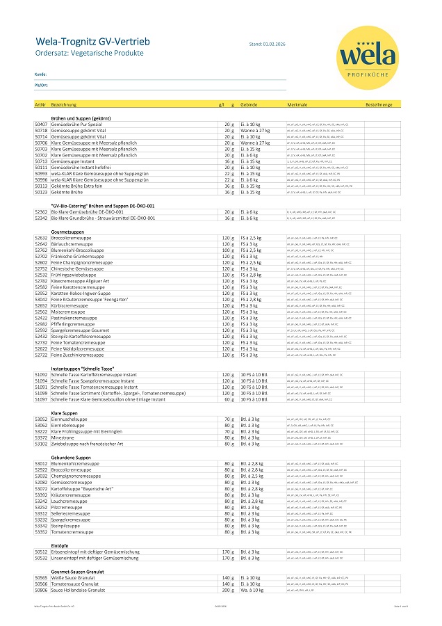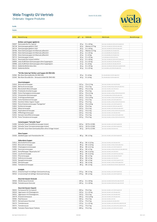 Sie möchten bei uns bestellen, dann nutzen Sie einfach unsere Ordersätze. Hier finden Sie alle aktuellen Wela-Produkte, bereit für den Einsatz in Ihrer Küche.